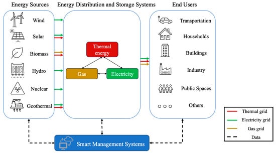 Initially, Dincer and Acar [42] introduced the framework for the ‘smart energy system’, advocating for its comprehensive coverage across every aspect of the energy supply and demand chain. Their conceptualization, known as the ‘3S concept’ (Source–System–Service), has evolved into the current model of smart energy systems. Energy-generating stations, energy transmission and storage infrastructure, smart energy management systems, and end users are the fundamental components of a typical smart energy system [43,44,45]. Energy-generating stations are responsible for producing energy to meet the diverse energy needs of end users. Energy transmission systems facilitate the transmission of energy from its sources to consumers, while storage systems store surplus-generated energy for later use. Smart energy systems control the entire system and its components. A comprehensive layout of a smart energy system is depicted in Figure 3.