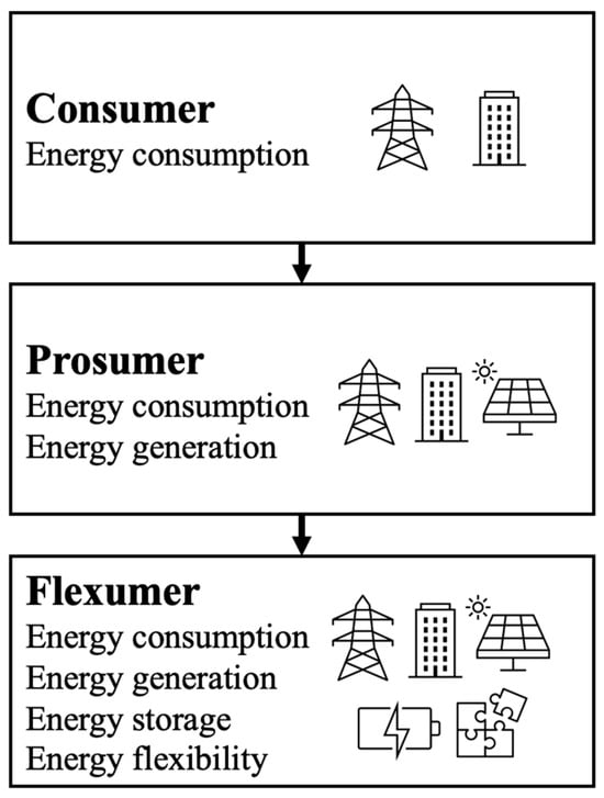 Expanding on the prosumer concept, the energy field has introduced the term ‘flexumer’. Coined by Bärwaldt in 2018 [247], flexumers boost the ability to adapt energy use, generation, and storage flexibly. Essentially, a flexumer enhances the energy functions of a prosumer by incorporating additional capabilities like energy storage and flexibility [248,249]. Flexumers, with their ability to regulate energy supply and demand (i.e., in response to energy network demands, operator and user requirements, and local climate conditions), offer valuable advantages to the distribution grid [248,249,250]. Figure 4 indicates the evolution of building energy roles, from consumers to prosumers, then flexumers. Jee et al. [251] pointed out key traits of flexumers based on price response, consistency, flexibility, and response speed, and developed a method to pinpoint them among regular consumers. Overall, the ‘flexumer’ concept offers a glimpse into the future of building energy management. However, for widespread adoption, further development is necessary, particularly in areas such as incorporating energy storage to maximize flexibility, which is further underscored by limited research on flexumers in the current literature.