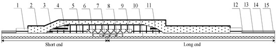 Cable joint 2D simulation model: 1—Block, 2—Copper shell, 3—Filling glue, 4—PVC belt, 5—Joint main insulation, 6—Copper screen tube, 7—Connection tube, 8—Air gap, 9—Shielding tube, 10—Conductor, 11—XLPE insulation, 12—Buffer layer, 13—Air gap, 14—Aluminum sheath, 15—Outer sheath.