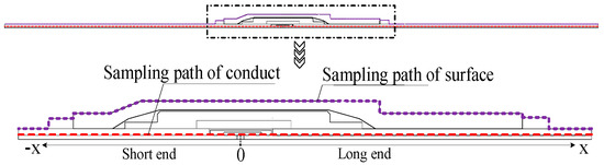 For the simulation model, the central location of the connection tube was chosen as the origin of the temperature sampling path, and the long end of the cable joint was set as the positive direction. Then, the detailed temperature distribution sampling paths for the cable joint conductor and surface are shown in Figure 3. The conductor temperature and surface temperature results along the sampling paths under different loads are presented in Figure 4.