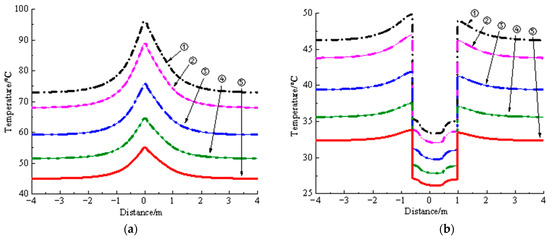 Temperature distribution results of the cable joint under different loads. (a) Conductor temperature, and (b) Surface temperature. Note: ①—the load is 1250 A, ②—the load is 1200 A, ③—the load is 1100 A, ④—the load is 1000 A, ⑤—the load is 900 A.