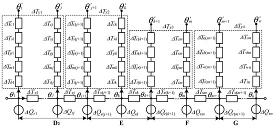 In (18) and (19), ΔTx is the axial thermal resistance between adjacent units within the same segment and ΔTxc is the axial thermal resistance of different segment connections. The weighted mean of the axial thermal resistance between adjacent units is taken as the value of ΔTxc, as shown in the following.