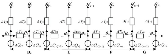 Based on the thermal simulation results in Section 3, it can be inferred that the surface temperature difference between adjacent cable joint units can be ignored when the cable joint is divided into a sufficient number of units. In [27], based on the assumption that the surface temperatures of adjacent units are the same, the quasi-3D thermal model for the short-conduit cable is simplified by using the Y-Δ transformation method. This simplified method is also feasible for the quasi-3D thermal model of the cable joint in this paper. The simplified quasi-3D thermal model of the long end of the cable joint is shown in Figure 7, which is also applicable for the short end of the cable joint.