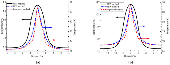 It is seen from Figure 8 that the temperature distribution curves calculated by three different methods have the same trend, with the temperature decreasing gradually from the center to both ends. The center of the connection tube is the peak temperature of the cable joint, thus the accurate thermal calculation for this point has great significance to the state evaluation of the thermal bottleneck point of the cable line. In Figure 8, it is clarified that the peak conductor temperature of the cable joint calculated by the TEA method has up to 20 °C difference with the simulation result, which shows that the TEA method has a low accuracy in the evaluation of the hotspot temperature of the cable joint. On the other hand, the difference of the peak conductor temperature results of the cable joint between the improved method and the FEA method is within 1 °C, which verifies the accuracy of the improved method.