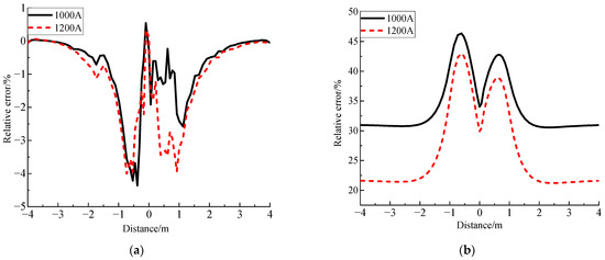 To further demonstrate the accuracy of the improved method, the result errors of both the improved method and the TEA method compared with the FEA method are shown in Figure 9a and Figure 9b, respectively. Figure 9a shows that the improved method results are basically lower than the simulation results, and the error is less than 5%, which can meet the requirements of engineering practice. The conductor temperature distribution curve obtained by the improved method is in good agreement with that obtained by the FEA method. Figure 9b shows that the TEA method results differ greatly from the simulation results, with the maximum error reaching 46%. Thus, the improved method can greatly improve the calculation accuracy of the conductor temperature of the cable joint, and realize an accurate thermal evaluation of the cable joint.