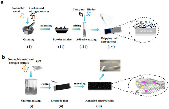 Generally, traditional composite catalyst cathodes were prepared by blending active catalytic materials (mainly non-precious metals, nitrogen source materials, carbon materials, etc.), combining additives (such as Nafion solution, ethanol), and conductive additives (mainly acetylene black, Figure 1a(iii)) [18]. The mixed slurry was then cast onto a collector (like Ni foam loaded with carbon cloth, Figure 1a(iv)). In this traditional structure, blending inactive components often impedes the transmission of electrolyte [9]. The planar collector offered a limited contact interface with active materials, leading to a low charge transmission. Compared to traditional electrode preparation, a self-assembled layered integrated electrode was designed through straight blending the active catalytic materials (including non-noble metals and nitrogen source) with a graphene oxide solution (Figure 1b(i)). Then, the slurry self-assembled into a free-standing film after low-temperature evaporation (Figure 1b(ii)). After annealing, independent electrodes could be formed without collectors (Figure 1b(iii)). By this approach, the electrode established a layered composition of the active material within the conductive matrix, enhancing charge transmission and ion diffusion (Figure 1b(iii)). Moreover, the thickness of the electrode could be conveniently modified, which was conducive to preparing electrodes with tunable mass load without the need for any adhesive. Thus, this approach could be regarded as a straightforward and versatile composition technique suitable for a wide range of active materials.