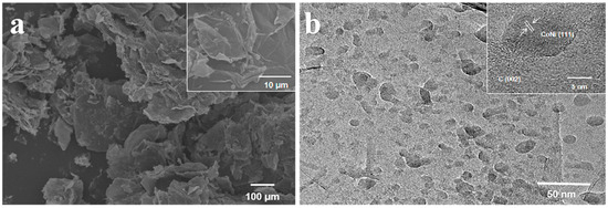 We then analyzed the morphological structure of the prepared CoNi/graphene film using SEM measurements (Figure 2a). These images showed that the graphene sheets exhibit a coiled state and some folded morphology, which is conducive to the loading of electrocatalysts. This is evidenced by the uniform distribution of particles on the sheets. Additionally, the TEM images in Figure 2b reveal that the CoNi compounds were evenly dispersed and attached to the carbon framework, which may promote charge transfer and active site exposure [8].