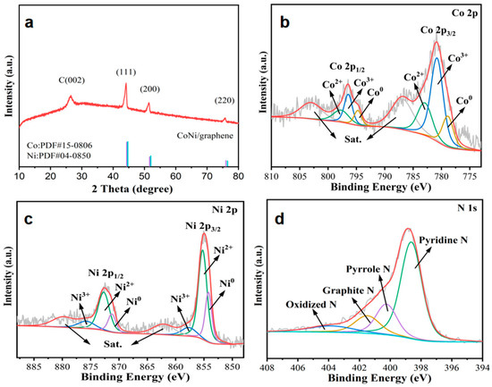 (a) XRD patterns of CoNi/graphene; (b) high-resolution XPS spectra of Co 2p; (c) Ni 2p; and (d) N 1s.