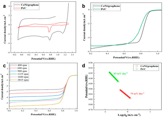 To further analyze the electrocatalytic properties of CoNi/graphene, we then conducted polarization curve testing on the CoNi/graphene catalyst at varying rotational velocities (400, 600, 900, 1225, 1600, and 2025 rpm). The results demonstrate a clear trend of the limiting diffusion current density increasing in correspondence with elevated rotational speeds, as illustrated in Figure 4c. A Koutecky–Levich (K-L) curve was used to determine the average number of electrons transferred by the CoNi/graphene catalyst during the ORR process, which was calculated to be approximately 4.1 [34,35]. These results suggest that the catalyst follows a four-electron transfer process in the ORR reaction.