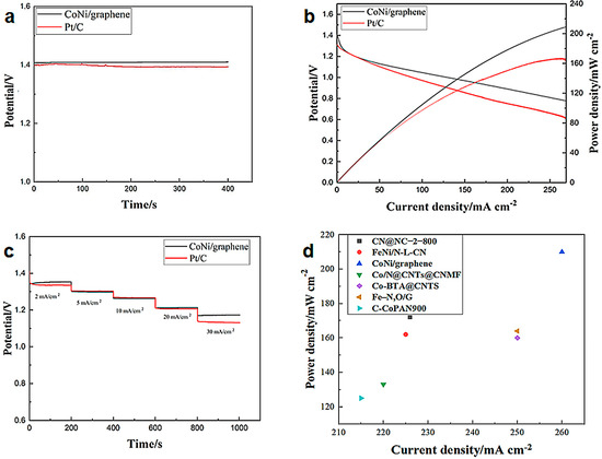 (a) Open-circuit voltage test of CoNi/graphene and Pt/C; (b) Polarization and power density curves; (c) Discharge curves of the CoNi/graphene and Pt/C batteries in 6 mol L−1 KOH at different current density; (d) Maximum values from polarization and power density curves of different catalysts.