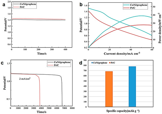 (a) Open-circuit voltage test of CoNi/graphene and Pt/C; (b) Polarization and power density curves; (c) Discharging curves of the CoNi/graphene and Pt/C batteries at 2 mA cm−2; (d) Specific capacity of CoNi/graphene and Pt/C.