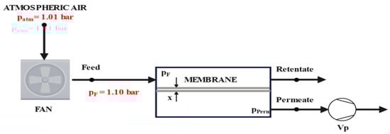 The process of single-stage membrane separation is depicted in the diagram in Figure 2. A unit for the direct capture of carbon dioxide from the air using membrane technology in its simplest single-stage configuration consists of a pre-fan, membrane, and vacuum pump. The pre-fan is responsible for providing slight positive pressure to the atmospheric air to feed the membrane. As a result of membrane separation, the feed stream is separated into the retentate stream and the permeate stream. The retentate stream consists of atmospheric air purified to some extent from carbon dioxide, while the permeate stream contains the separated gas component of certain purity. The efficiency of the membrane separation process is mainly determined by the pressure difference between the feed and permeate [,]. To ensure the pressure difference in the system, a vacuum pump is employed.