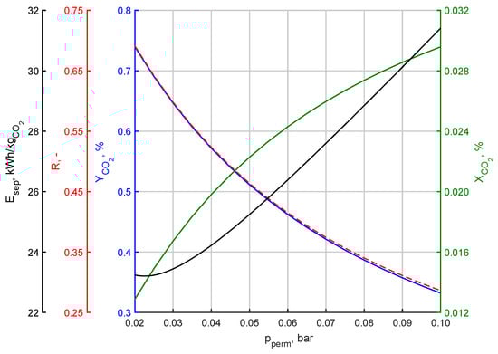 In the first stage of calculations, the influence of permeate pressure change on the basic characteristics of the membrane separation unit was determined. Parameters such as the carbon dioxide content in the permeate and retentate , recovery rate , and energy intensity ( were presented as functions of for the reference membrane with a selectivity of and permeability of . The membrane surface area was assumed to be for the calculations. The graphical interpretation of the results for the permeate pressure range of 0.02 bar to 0.1 bar is shown in Figure 3. Changes in pressure were made with a step of 0.01 bar. With an increase in permeate pressure, a decrease in both the recovery rate and the percentage of CO2 in the permeate can be observed. The greater the pressure difference between the feed stream and the permeate, the more efficient the separation process. By increasing the permeate pressure, we decrease the pressure difference in the system, resulting in a smaller amount of captured CO2. Consequently, the carbon dioxide content in the retentate increases. Due to the inefficiency of the process, even with a reduction in the power consumption of the vacuum pump, there is a noticeable increase in energy consumption expressed in kWh per kg of separated CO2. Therefore, maximizing the pressure difference is beneficial in terms of achieving the highest recovery rate and CO2 content in the permeate, and the lowest energy intensity and CO2 content in the retentate.