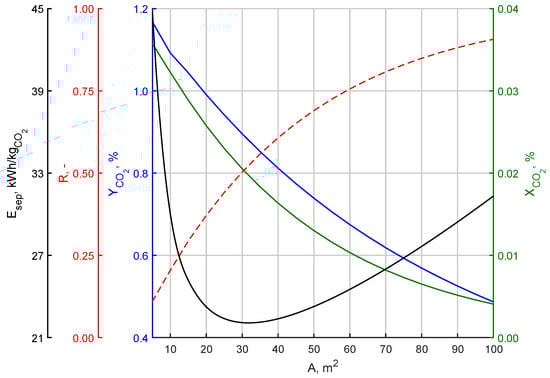 Understanding the impact of pressure changes on key system parameters, the focus was on analyzing the effect of membrane surface area. According to Equation (1), membrane surface area determines the value of the permeating flux through the membrane. It also has economic significance. For the reference membrane, based on the analysis results presented in Figure 2, the lowest permeate pressure was set to . The membrane surfaces were varied in the range from 5 m2 to 100 m2 with a step of 5 m2. The results are shown in Figure 4. For larger membrane surfaces, the system exhibits a high degree of carbon dioxide recovery. However, the share of CO2 in the permeate decreases, indicating that the membrane tends to allow other gas components to pass through. Selecting the optimal membrane surface area to minimize the energy intensity of the separation process can be challenging. Both too large and too small membrane surfaces lead to an increase in the energy required to separate 1 kg of carbon dioxide. Therefore, there is an optimum membrane surface area selection to minimize the energy intensity of the carbon dioxide separation process from the air. The minimization of process energy intensity can be observed in the area defined by the intersection points of the characteristics of carbon dioxide content in the permeate and retentate with the recovery degree characteristic. However, an increase in process energy intensity becomes noticeable after exceeding the intersection point of the CO2 content characteristic in the permeate. If there is a decrease in CO2 participation in the permeate along with a decrease in its participation in the retentate, it means that the membrane, although capable of separating carbon dioxide, tends to allow the passage of other gas components. As a result, the gas flow handled by the vacuum pump increases, directly impacting energy intensity in the process. Therefore, the compromise between and the recovery coefficient , represented by their intersection point on the characteristic as a function of membrane surface area, determines the optimal membrane surface area in terms of energy intensity.