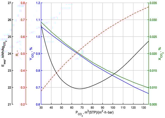 The effect of changing the permeability of CO2 on the performance characteristics of the membrane separation system was also determined. The analysis was conducted for a membrane selectivity of . Again, a permeate pressure of was applied, and the membrane surface area for calculations was assumed to be . The results are presented in Figure 5. Table 2 shows the CO2 permeability and permeability of other gas components depending on membrane selectivity. The obtained characteristics as a function of changes in permeability are similar in trend to the characteristics obtained as a function of changes in membrane surface area. Both the CO2 content in the permeate and in the retentate decrease with increasing CO2 permeability across the entire analyzed range. The opposite situation occurs for the purity index of the permeate R. Higher membrane permeability allows for more CO2 to be recovered in the permeate stream. However, according to the data presented in Table 2, it also affects the increase in the permeability of other gas components, resulting in a decrease in the percentage of CO2 in the permeate. As a result, a product of low purity is obtained. In the case of energy intensity, a local minimum occurs again. Initially, the energy intensity of the process decreases, but after crossing a certain threshold, it increases with increasing CO2 permeability. Again, the critical point is the intersection of the characteristics of the CO2 content of the permeate and the recovery factor. The decrease in the carbon dioxide content of the permeate as the permeability of the membrane increases and its selectivity remains constant can be explained by Equation (4). According to this, as the permeability of CO2 increases, the permeability of the other gas components also increases, as shown in Table 2. Consequently, the gas flow operated by the vacuum pump increases again, leading to an increased energy intensity of the process.