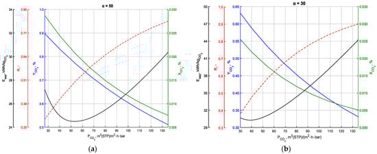 In the next step, the analysis focused on the impact of changing membrane selectivity on the system’s performance characteristics. For this purpose, calculations similar to those presented in Figure 5 were repeated for selectivities of and 30. The results are shown in Figure 6. With a change in membrane selectivity, its ability to permeate other gas components also changes, according to Table 2. Comparing Figure 5 and Figure 6, it can be observed that reducing membrane selectivity results in a decrease in the proportion of CO2 in both the permeate and retentate, while the recovery rate increases. A membrane with higher selectivity thus ensures a better concentration of carbon dioxide in the permeate, but this leads to a greater loss of the separated gas component in the retentate stream. For example, considering a membrane with and a permeability of , the CO2 content in the permeate is 0.74%. However, for α = 50 and 30, it is 0.58% and 0.38%, respectively. Consequently, a multi-stage membrane DAC system based on membranes with lower selectivity will require more separation stages to obtain a permeate with high final purity. Therefore, the use of low-selectivity membranes is inappropriate, consistent with the results presented in other studies [,]. Comparing the recovery rate, it is 69.5% for , and 76.0% and 83.5% for and 30, respectively. With decreasing membrane selectivity, the energy intensity of the process also significantly increases. For example, considering a membrane with a permeability , the energy intensity of the process was 23.12 27.68 , and 39.01 for = 70, 50, and 30, respectively. In the case of a membrane with = 30, unlike the other variants, a local minimum occurs for the lowest values of the analyzed carbon dioxide permeabilities.