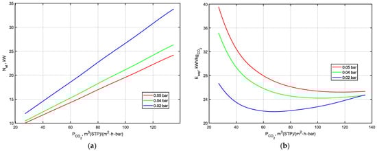 Selecting the appropriate membrane and process parameters is highly challenging. A membrane separation process should be characterized by the highest possible content of the desired gas indicator in the permeate and the highest possible recovery rate. From an energy perspective, the process should also exhibit minimal energy intensity while ensuring the highest possible values of the aforementioned parameters. As mentioned earlier, the driving force of the membrane separation process is the pressure difference across the membrane. Ensuring a greater pressure difference between the feed and the permeate, despite the increased power demand of vacuum pumps, does not necessarily result in increased energy consumption of the process in terms of energy used to separate 1 kg of carbon dioxide, as shown in Figure 3. Properly selected pressure values will affect the efficiency of the separation process by increasing the amount of separated gas component, directly influencing the defined energy intensity expressed in . To better illustrate the problem, Figure 7a shows the power consumption of flow machines in a single-stage membrane separation process as a function of carbon dioxide permeability for a membrane with parameters and . Calculations were performed for various permeate pressures. Figure 7b, on the other hand, shows the energy intensity of the process. The power of the vacuum pump increases with the increasing permeability of CO2 throughout the analyzed range. This is because, with increasing CO2 permeability, the permeate flow increases, and thus the flow that the vacuum pump must handle also increases. Due to the constant flow of intake air, the power of the pre-fan remains constant. Comparing both analyses, it is also clear that a greater pressure difference between the feed and the permeate (thus a lower permeate pressure) translates into lower energy intensity of the process of separating 1 kg of carbon dioxide. Only in the case of membranes with high permeability of the separated gas does the energy intensity of the process for a pressure of 0.02 bar clearly increase, reaching a level corresponding to a pressure of 0.04 bar. Table S1 in the Supplementary Materials contains trend line equations and the coefficient of determination (R2) for the data presented in Figure 4, Figure 5, Figure 6 and Figure 7.