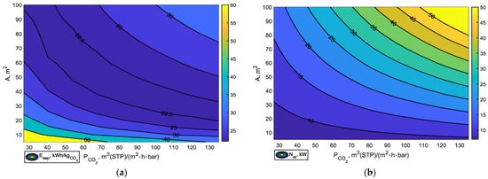(a) The dependence of the line constants of the values of the energy intensity of the separation process on the plane of the area and CO2 permeability of the membrane. (b) The dependence of the line constants of the value of the consumed electric driving power of the flow machines on the plane of the surface area and CO2 permeability of the membrane .