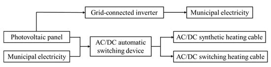 According to the building’s heating load and temperature variations, the system prioritizes using photovoltaic power generation to supply the heating terminal devices. When the DC power is insufficient, it switches to the municipal power supply to meet the heating demand. Both the AC/DC switching heating cables at the terminal and the AC/DC composite heating cables can utilize photovoltaic DC power. During non-heating periods, excess electricity can be fed back to the grid.