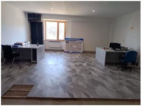 The test site was in an ultra-low-energy public building at a university in Changchun, Jilin Province, China. Ultra-low-energy buildings are the primary form of near-zero energy buildings, and for public buildings, the energy consumption level needs to be reduced by more than 50% compared with the “GB 50189-2015 Energy Efficiency Design Standard for Public Buildings” []. By optimizing the building envelope to improve the use of renewable energy in the building system [], compared with traditional buildings, this building type can achieve energy savings of more than 80%−90%, which is considered to be the most effective way to reduce buildings’ energy consumption, reduce carbon emissions, and improve indoor thermal comfort []. The building has a single-sided walkway with a flat roof on the second floor. The test room is located on the south side of the second floor (Figure 3), with a construction area of 65.45 m2 and a building height of 3.6 m.