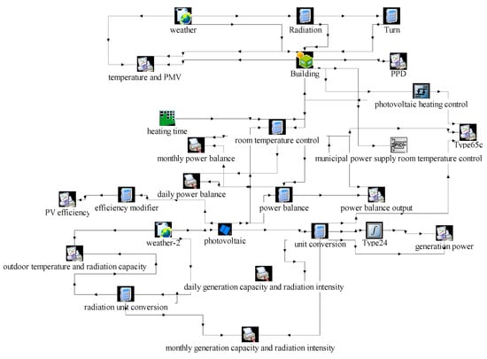 The structure of the photovoltaic direct-drive and grid-coupled heating system (PVDD and GC) is shown in Figure 1, through photovoltaic power generation for building heating, effectively reducing building energy consumption []. This system mainly consists of a photovoltaic power generation system, municipal power supply system, and heating terminal system. The main components include photovoltaic panels, inverters, AC/DC switching devices, data monitoring devices, and heating terminal devices; the parameters of the photovoltaic panel, inverter, and Figure 2 exhibits the flow chart of each section.