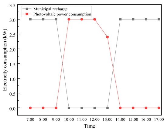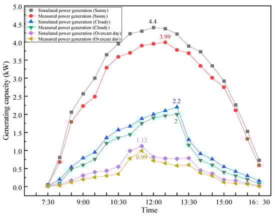 Figure 8 shows the hourly power generation of the photovoltaic panels on sunny, cloudy, and overcast days; the maximum power generation was 4.49 kW, 1.5 kW, and 0.72 kW, respectively, while the minimum power generation was 0.03 kW, 0.02 kW, and 0.39 kW, respectively, during the heating season in Changchun.