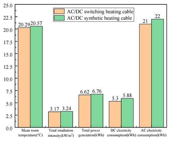 As shown in Figure 29, under the two heating cable modes, the average indoor temperature of the AC/DC synthetic heating cable mode was 2.91% higher than that of the AC/DC switching heating cable mode. Under the same all-day irradiation intensity and total power generation, the utilization rate of direct current generated by the photovoltaic panels was high, the DC power of the AC/DC synthetic heating cable was 8.75% higher, and the AC power consumption was 26.67% lower than that of the AC–DC switching heating cable.