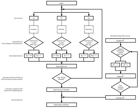 The agent is awarded additional reward points for adhering to the learned policy [39]. Upon completion of the final action, the environment state is terminated, initiating a thorough examination to ascertain if the maximum capacity of the least expensive GenUnit has been reached. Following this, the embedded accelerator mechanism is promptly activated. If the least expensive GenUnit has been dispatched at the desired generation level, the agent receives a combined reward, prompting the dispatch of the next available cost-effective GenUnit. This strategy showcases its notable effectiveness, especially in the early phases of the RL algorithm when the agent’s actions lack clear direction, highlighting the efficacy of the proposed approach in managing intricate environments with prolonged convergence times, thereby accelerating the acquisition of the desired behavioral policy by the agent. A comprehensive depiction of the proposed reward system is provided in Figure 2.