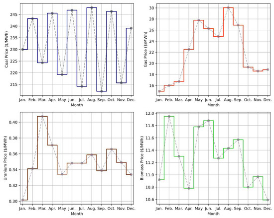 In order to address the optimization problem described by (2), it is necessary for the agent to have access to data regarding fuel costs and O&M costs. These costs have been sourced from the annual reports of the U.S. Energy Information Administration (EIA) and have been converted to units of USD/MWh. The combination of all these data sets defines the majority of the RL environment in this study. Figure 3 provides a graphical representation of monthly fuel costs for the year 2022 in USD/MWh for each GenUnit under study. Enriched uranium serves as the conventional fuel choice for the SMR under study, while alternative materials, such as thorium, may be utilized. It is evident that coal exhibits the highest fuel cost, while uranium indicates the lowest cost per MWh. It is notable that the RES under examination demonstrate zero fuel costs. This emphasizes the importance of considering various energy sources and their associated costs when optimizing the system.
