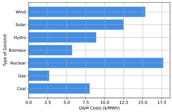 Furthermore, Figure 4 provides a visual representation of the O&M costs associated with each GenUnit under examination. Despite the relatively low fuel cost of uranium, it is noteworthy that GenCoA’s SMR displays the highest O&M expenses. Despite their smaller size, SMRs may still incur significant expenses due to the complexity of their designs, stringent regulatory requirements, and the need to deploy them in remote or off-grid locations. Furthermore, unlike larger reactors that have longer refueling intervals, SMRs typically require more frequent refueling due to their smaller size and power output. These refueling procedures involve shutdowns, labor, and material costs, all of which contribute to the higher O&M costs. Conversely, GenUnits reliant on fossil fuels, such as gas and coal, demonstrate comparatively lower maintenance costs. This discrepancy underscores the diverse cost structures inherent in different types of generation technologies and emphasizes the importance of considering both fuel and O&M expenses when evaluating the economic viability of energy-generation options. The agent should possess the capability to adapt to fluctuations in these data sets, as they directly impact the optimization of economic dispatch within the power system.