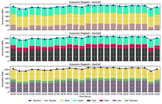 Although there are minor differences in the O&M costs and capacities of RES, and due to the fact that each GenCo operates with its distinct combination of energy sources, it is not necessary for them to standardize their GenUnits for comparison. Initially, during the dispatch of RES, generation costs across companies generally exhibit minimal variation. However, as the demand necessitates the dispatch of baseload generation units, disparities in profitability become evident, leading to increased generation costs and subsequent profit differentials. Thus, each GenCo’s unique energy portfolio necessitates flexibility in unit selection. Furthermore, the capacity of these baseload generation units does not significantly affect the economic dispatch process, since they typically operate below their full capacity. Therefore, variations in the capacities of baseload generation units among the GenCos under study are acceptable and do not hinder the comparability of results.