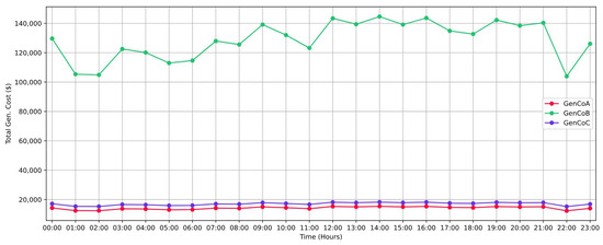 Total production costs of the analyzed GenCos for meeting the 24 h load demand.