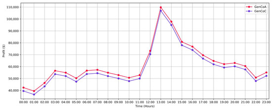 As depicted in Figure 7, GenCoB emerges with the highest production costs among the trio of GenCos under examination. This elevated cost is primarily attributed to the significantly higher expenses associated with coal compared to other energy sources within its energy mix. The prevailing composition of energy sources results in a notably augmented energy generation cost for GenCoB, rendering it distinctly unprofitable. Furthermore, it is important to highlight the consistent lower electricity generation costs of GenCoA compared to GenCoC throughout the observed period. This sustained pattern underscores the superior cost efficiency of GenCoA’s operations relative to GenCoC. Given these noticeable disparities in production costs, our analytical focus naturally gravitates towards examining the profitability dynamics of GenCoA and GenCoC. Conversely, the notably higher costs incurred by GenCoB render it less relevant to our profitability analysis.