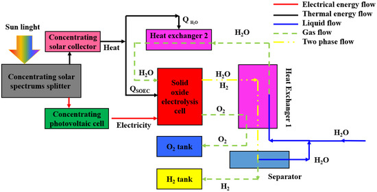 Currently, there are several technologies available for hydrogen production from water decomposition, including electrolysis, photocatalytic processes, and thermochemical processes [10]. Among them, water electrolysis has gained significant attention as a hydrogen production method due to its high purity and environmentally friendly nature [11]. However, due to the large amount of electricity required, it is relatively expensive in terms of cost-effectiveness [12,13]. Solar energy, as the most plentiful and environmentally friendly renewable energy source, presents a promising solution for hydrogen production by integrating photovoltaic conversion and electrolysis [14,15]. This approach not only reduces the cost of hydrogen production but also enables the storage of intermittent and fluctuating solar energy in the form of hydrogen fuel. Compared to low-temperature electrolysis, such as proton exchange membrane electrolysis cells and alkaline water electrolysis cells, solid oxide electrolysis cell (SOEC) has a notable cost advantage [16]. This is primarily attributed to the utilization of a high operating temperature, which minimizes the electrical energy requirement, enhances electrode activity, and reduces overpotentials during the electrochemical processes [17,18,19,20]. The fundamental principle behind the use of solar-driven SOEC for hydrogen production involves the efficient utilization and splitting of the solar spectrums using a concentrating solar spectrums splitter (CSSS). The CSSS effectively directs sunlight to a concentrating photovoltaic (CPV) system and a concentrating solar collector (CSC) [21,22,23,24]. The CPV system converts the shorter wavelengths of solar energy into electricity, while the CSC collects and converts the remaining wavelengths of solar energy into heat. The electricity and heat generated by the CPV and CSC are then supplied to the SOEC for hydrogen production [25,26,27]. Consequently, the hybrid system combining CSSS and SOEC technologies holds great promise for efficient and sustainable hydrogen production.