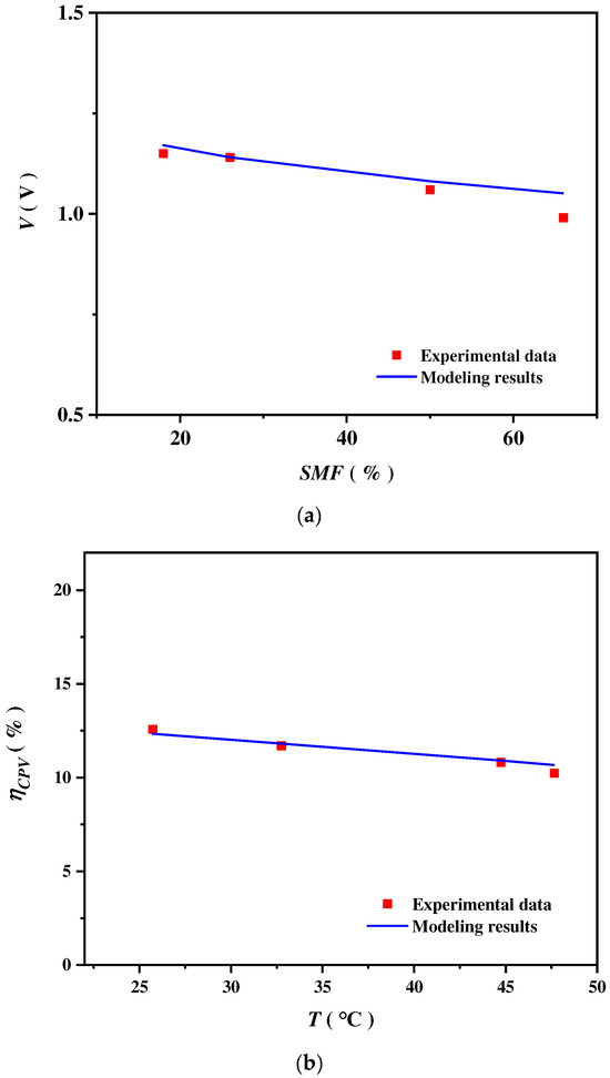 (a) The modeling and the experimental results of the potential of an SOEC varying with a steam molar fraction (SMF). The experimental data are from [80]. (b) The modeling and the experimental results of the CPV energy efficiency varying with the operating temperature . The experimental data are from [81].