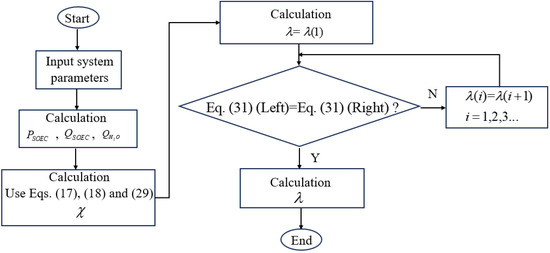 In this section, the influences of some critical operational conditions and design parameters, including the support types, the operating temperature, the inlet flow rate of the water, the operating pressure of the SOEC, the effectiveness of the heat exchangers, the operating temperature, optical concentration ratio, the electric current of the CPV, and the operating temperature of the CSC, on the balance parameter () and the cut-off wavelength splitting the solar spectrum () are discussed. Thus, some useful suggestions on how to operate the CSSS for SOEC hydrogen production are given. Unless explicitly specified, the default parameters detailed in Table 1 and Table 2 are assumed for the calculations. The model of the CSSS-SOEC is solved using the iterative method by MATLAB R2018b software, and the detailed flow chart can be found in Figure 3.