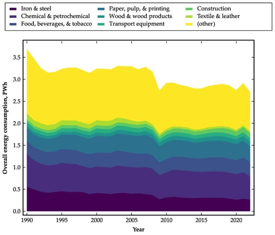 The latest statistical data for 2022 and the individual sectors within EU27 [47] (datasets newer than 2022 are not yet available) show that the industry as a whole accounts for 25% of the total energy consumption (see Figure 1). Figure 3, which is based on the same statistical data source, presents the overall energy consumption in specific industries for the last 32 years. An earlier study by Brückner et al. [38] claimed that in the European Union, the industries with the greatest production of waste heat are the (petro)chemical, iron and steel, food and tobacco, and pulp and paper industries. Judging by the latest EU27 data (Figure 3), this still is the case. Bianchi et al., in their 2019 study [11], stated that these four industries accounted for almost 60% of the overall theoretical potential, while according to Figure 3, this would in 2022 amount to approx. 54%, or 1.47 PWh.