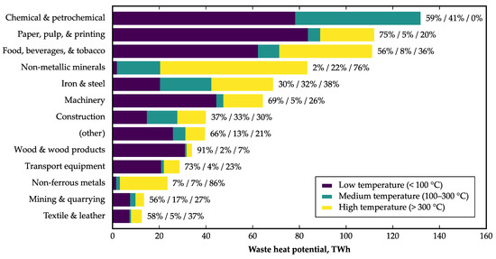 The estimated overall waste heat potential in the major EU27 industries is shown in Figure 4. The necessary energy consumption data were taken from the latest dataset [47], while the waste heat ratios and temperature distributions per industry correspond to those published by Bianchi et al. [11].