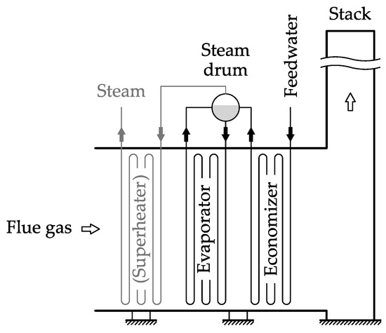 Typical arrangement of a waste heat boiler; the superheater is only present if the waste stream temperature is high enough.