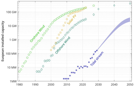 Historical growth and future estimates of European deployment of renewable technologies (EU27+UK), solar PV, onshore and offshore wind data [33,34,35,36,37]. Tidal stream shows historical deployments and known projects [25], plus a plausible growth scenario reaching 20–40 GW by 2050 [32]. Figure adapted from [32].
