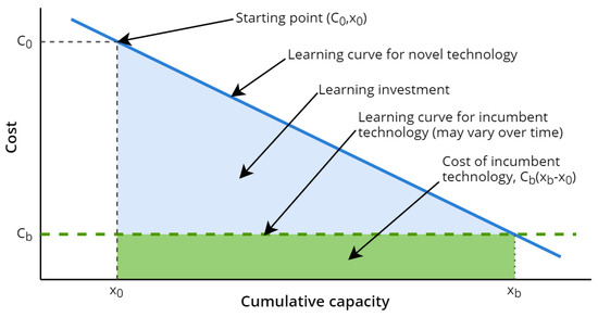 Graphical illustration of the learning investment required to reach a breakeven cost level . Shown on log–log axis. Adapted from [38].