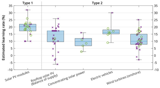 Range of estimated CAPEX learning rates for different technologies. For each box, the quartiles and whiskers cover the full range of values. Individual studies shown by markers: green circles represent a global scope, purple crosses for country/regional scope. Adapted from [45].