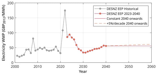 As noted in Section 3.1.2, the electricity wholesale market price for each year is from DESNZ projections out to 2040. Beyond this, two assumptions have been used: a baseline of a constant price—scenario (a) in the results—and a sensitivity of a linear 5% increase per decade.
