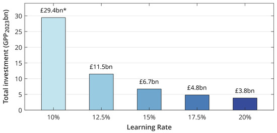 An earlier study by the Carbon Trust [26] did consider the amount and cost of subsidised deployment required; however, the methodology used to calculate this is not stated, and the assumptions used are now slightly dated. A sensitivity analysis of the ‘learning investment’ (analogous to the subsidy required) was presented by MacGillivray et al. [27]; although, this only considered CAPEX, given the uncertainty in the project lifetime considerations required to calculate LCOE. Kerr et al. [28] focused on the impact step-change cost reductions from radical innovation could have on the costs of commercialising a technology such as wave energy, showing that high starting costs and low learning rates may lead to an infeasibly large investment required to drive costs down through learning by doing alone. A wider range of scenarios and other considerations were included in related work within the DTOceanPlus (Advanced Design Tools for Ocean Energy Systems Innovation, Development and Deployment) project [29].