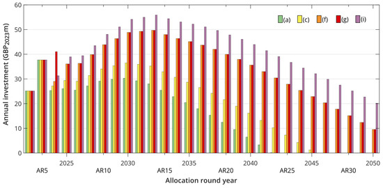 The modelling is sensitive to future electricity prices; however, it is beyond the scope of this analysis to consider this in detail, and there is considerable uncertainty especially in the long term. It is important to remember that the CfD subsidy is for a period of 15 years, and the deployment is assumed to occur 3–5 years after the auction, therefore the total subsidy is based on the average electricity price over the period 3–20 years following the allocation round (AR).