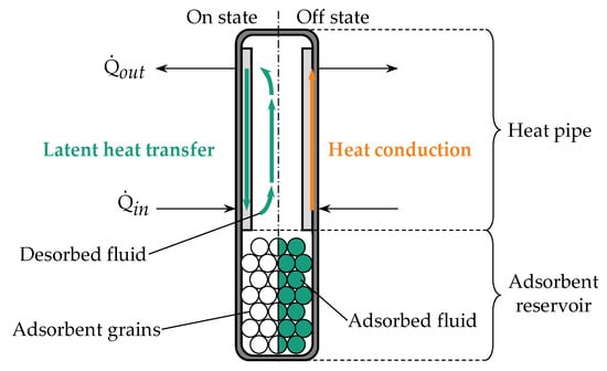 A novel heat pipe-based approach was presented by Winkler et al. [12,13]. Here, a water-loaded adsorbent was integrated into the evaporator region of a copper–water heat pipe. The adsorbent releases a significant amount of the heat pipe’s working fluid by desorption once a certain temperature threshold at the evaporator is exceeded, thus lowering the heat pipe’s thermal resistance. If the temperature falls below the threshold, the working fluid is reversibly adsorbed, leading to a higher thermal resistance. Figure 1 illustrates the basic principle of the adsorption-based heat pipe.