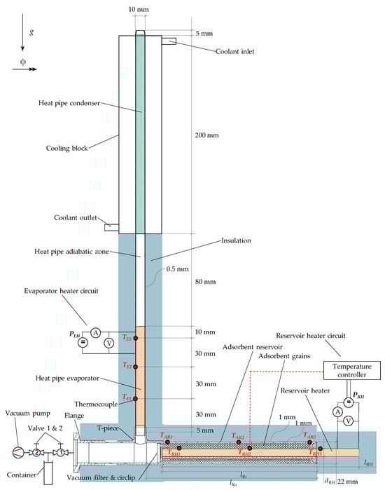 The experimental setup is shown in Figure 2. The basis of the experimental setup is the demonstrator, an adsorption-based heat pipe, which consists of a copper–water heat pipe, a separate copper adsorbent reservoir, and a flange. In this work, two demonstrators were designed that differ regarding the adsorbent reservoir design. All components except the flange are made of copper (alloy type CW024A) and are laser-welded to a T-piece. The flange is made of brass and is soldered to a tube that connects to the T-piece. All welding seams and the solder joint are coated with synthetic rubber (HumiSeal by Ellsworth Adhesives, Germantown, WI, USA) to ensure vacuum tightness. The demonstrator is wrapped in a tubular thermal insulation with a thickness of 20 mm. The insulation material is HT/Armaflex, an elastomer foam provided by Armacell Enterprise (Manchester, UK), with a nominal thermal conductivity of 0.042 Wm−1K−1 at 40 °C.