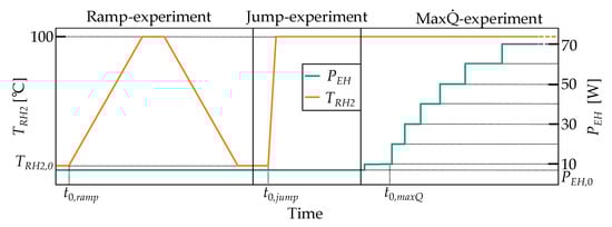 To analyze the demonstrator regarding its characteristic properties that are described in the introduction of this work, 3 dedicated experiments have been developed. The objective is to obtain information about the demonstrator’s thermal resistance in both the off and on state at various heat input levels, as well as the transient response, which refers to the temporal progression of the thermal resistance. The experiments differ in terms of the boundary conditions that are applied via the temperature-controlled reservoir heater and the heat pipe evaporator heater. Figure 4 shows the temporal progression of the imposed boundary conditions.