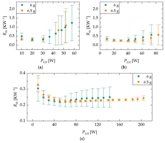 Results of the max experiment with against-gravity (a), horizontal (b) and vertical orientations (c) of the heat pipe and different water loadings of demonstrator D1. Each dot represents the heat pipe’s thermal resistance in a steady state for different evaporator heater powers . The error bars represent an indicator of temperature deviations along the evaporator region, indicating the degree of evaporator dry-out. Limits of the heat transfer rate in different orientations can be observed.