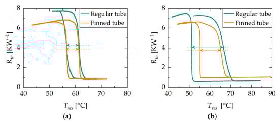To assess how the heat exchanger design affects the dynamic properties of switchable heat pipes based on adsorption, an additional ramp experiment was conducted. In this experiment, the behaviors of the two demonstrators D1 and D2 at high and low ramp rates in vertical orientation (ϕ = 90 °) were examined. The graphs in Figure 7 display the heat pipe’s thermal resistance plotted against the average adsorbent reservoir temperature , with a ramp rate of 0.05 Kmin−1 on the left and 0.63 Kmin−1 on the right. It can be observed that the demonstrators exhibit different hysteresis behaviors with respect to varying ramp rates.